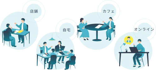 少しでも負担にならないようご相談は店舗やご自宅、最寄りのカフェ、オンラインでもあなたの希望に合わせてお選び頂けます。