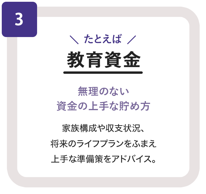 - FPならではの専門的な視点からアドバイス。 保険相談はもちろん、家計の見直しや資産形成、教育資金、住宅ローン、老後資金など、あらゆるご相談に幅広く対応いたします。