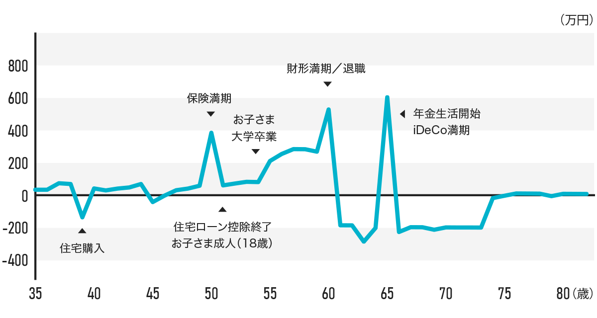 ※ このグラフは上記ライフプランから作成し現在の収支をもとに、今後の収支のイメージを分かりやすくまとめたものです(総資産の推移を示すグラフではありません)。