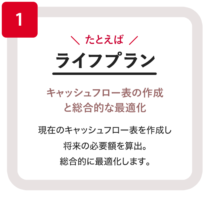 - ヒアリング内容をもとにお客さまのキャッシュフロー表を作成します。 今後予想されるライフイベントや生活環境に合わせて、将来必要となるお金を具体的なデータで確認します。
