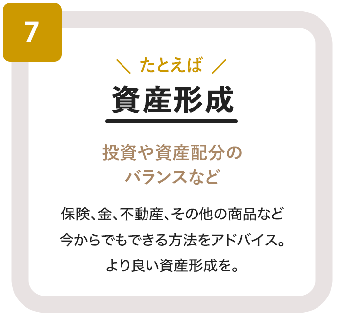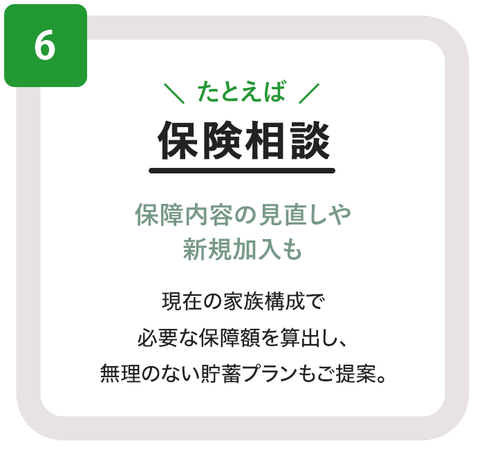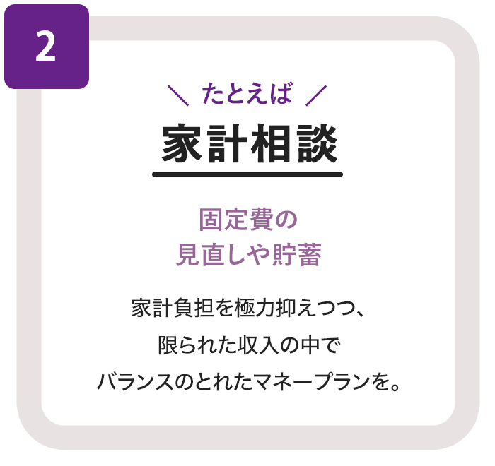 - FPならではの専門的な視点からアドバイス。 保険相談はもちろん、家計の見直しや資産形成、教育資金、住宅ローン、老後資金など、あらゆるご相談に幅広く対応いたします。