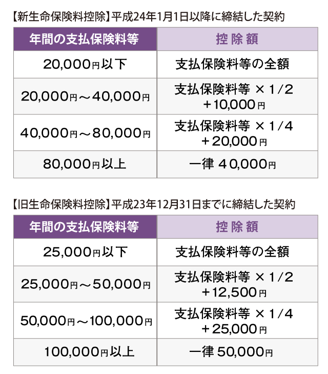 平成22年に税制改正があり、平成24年1月1日以降の契約には新生命保険料控除が、それ以前の契約には旧生命保険料控除が適用されます。新生命保険料控除は、以下の3つに分類されます。