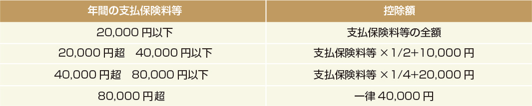 所得税では、年間の支払保険料が80,000円までが対象となり、控除の上限は40,000円(3種合計で120,000円まで)、住民税では、年間の支払保険料が56,000円までが対象となり、控除の上限は28,000円(3種合計で70,000円まで)です。