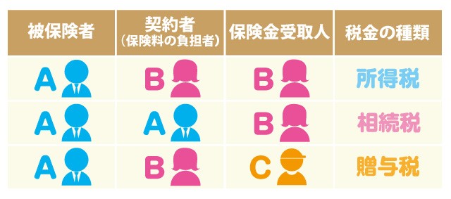 税金の種類は保険の契約者、被保険者、受取人の関係によって決まり、下記のように分類されます。