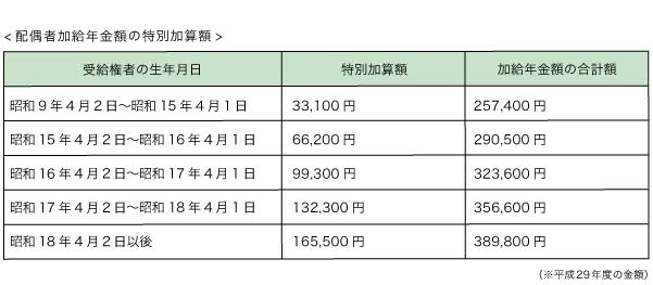 加給年金の対象となる家族がいる場合、上乗せされる金額は対象者によって変わってきます。詳しい加算年金額は以下をご覧ください。さらに、配偶者の加給年金額は、老齢厚生年金を受給している方の生年月日に応じて、特別加算されます。
