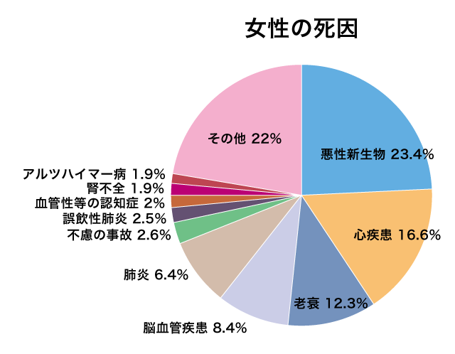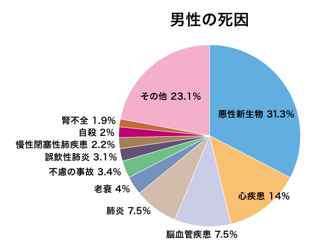 以降、3~5位は男女によって順位は変わりますが、肺炎、脳血管疾患、老衰と同じ項目が占めています。この5項目によって、日本人の7割近くの方が亡くなっているのです。