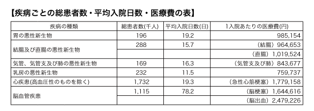 下記に疾病ごとの患者数、平均入院日数、1入院あたりの平均医療費をまとめました(医療費は10割負担の場合で記載)。